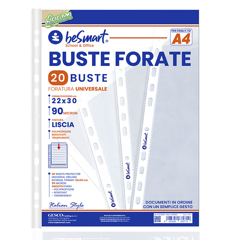 BUSTE FORATE LISCE A4 90MICRON CF 20PZ BESMART