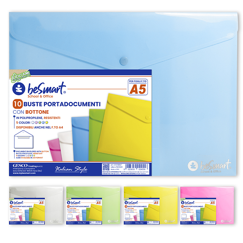 BUSTE PORTADOCUMENTI A5 CF 10PZ CON BOTTONE 5 COL. ASS. BE SMART